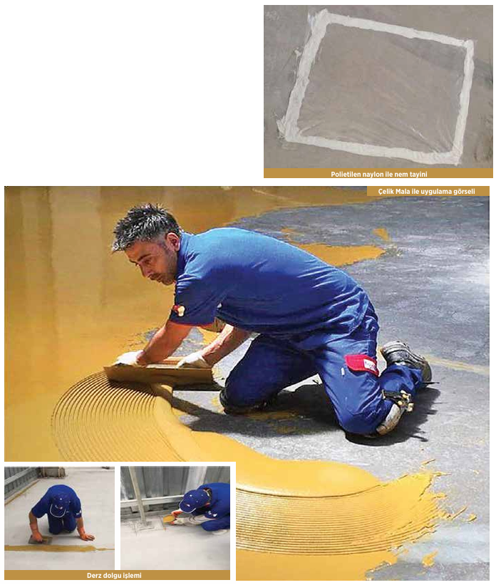 Ayrıca eski veya yeni tüm beton zemin kaplamalarından yükselen nem olmamalıdır. Zemin suları yükselerek betonun kapiler özelliğinden dolayı yüzeye taşınır. Bu durum zemine yapılan kaplamaların zeminden ayrılarak kalkmasına ve kabarmasına sebep olur. Bu etki basit polietilen örtü testi ile tespit edilir. Şeffaf bir polietilen (naylon) örtü beton yüzeye kenarlarından nem geçirmeyecek şekilde poliüretan mastik ile yapıştırılır. Zeminden gelen nem, polietilen örtü altında birikerek damlacıklar halinde görülür, bu şartlarda zemin kaplaması yapılmamalıdır. Eğer örtü yapıştırıldıktan 24 saat sonra kontrol edildiğinde nem gözlenmiyorsa kaplama yapılması uygundur.