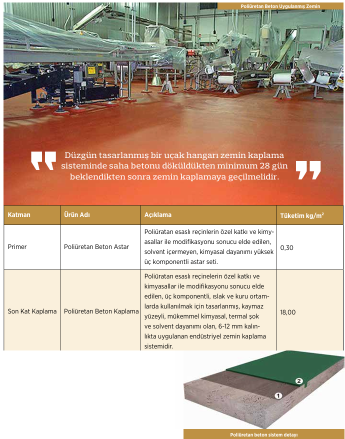 Doğru ürün seçimi, zemin hazırlığı ve düzgün uygulama ile istenen performansı uzun yıllar sağlayacak bir uçak hangar zemini bu şekilde tasarlanıp uygulanabilir.