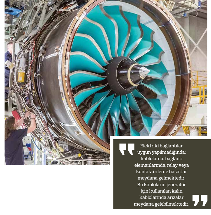 Buraya kadar her şey kurallara göre doğru oldu. Şimdi filmimiz başlıyor. Uçaklarda uygulanan E/O’lardan sonra; Airbus için ESPM (Electrical Standart Manual), Boeing SWPM (Standart Wiring Practices Manual) de yazan crimping, pin, sochet, clamp, space, die, sheild splice, heatgun, insert-recract, base, sleve, heated sleve, strapgun, ground (negatif DC volt), ground (AC volt) bonding cable, tool’lar ve elektriki bağlantılar uygun yapılmadığında; kablolarda, bağlantı elemanlarında, relay veya kontaktörlerde hasarlar meydana gelmektedir. Bu kabloların jeneratör için kullanılan kalın kablolarında arızalar meydana gelebilmektedir. Peki ne gibi problemler olabilir? Kablolar, açık devre, kısa devre ve başka kablolarla kısa devrede olabilirler. Bu arızalar nasıl tespit edilir? Uçaklarda kullandığımız, GCU (Generator Control Unit) dediğimiz kontrol box’lar, ana üç fazlı kablolarda kullanılan CT (Current Tranformer) dediğimiz her bir fazdan çekilen akımlar ve kendi aralarında çekilen akımlar, box’larda daha evvelden software değerleri ile karşılaştırılır. Eğer CT’lerden gelen akım değerleri, software değerlerinin dışında ise (out of range) o zaman GCU koruma devresi (protection) ile açık, kısa devre durumlarında uçaklarda yangın çıkma ihtimali yüksek olabileceğinden, kendine ait jeneratörün elektrik üretmesine izin vermez. Uçaklarda da bu arızaları gördüğümüzde, GCU ön yüzünde yanan lamba veya onboard maintenance özelliği olan uçaklarda CFDS/CMS MCDU, MAT üzerinden görebiliriz.