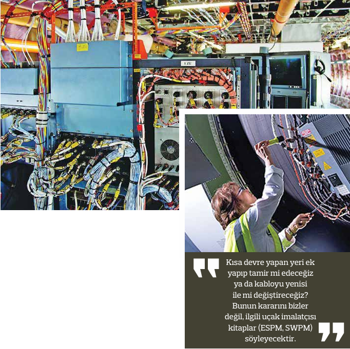Kısa devre yapan yeri bulduk, peki neden kısa devre olmuştur? Büyük bir olasılıkla oralarda daha önceden, yapısal atölyesi çalışmış ve blend ya da delik deldikleri için metal talaşları kabloları zamanla hasarlanmış olabilir. Peki başka ne olabilir, daha önceden bir E/O uygulanmış, kelepçenin yönü, kelepçenin içindeki koruyucu lastiği ya da kelepçe küçük ya da büyük takılmış, zamanla vibrasyondan kablolar kısa devre yapmış olabilir. Peki kısa devre yapan yeri ek yapıp tamir mi edeceğiz ya da kabloyu yenisi ile mi değiştireceğiz? Bunun kararını bizler değil, ilgili uçak imalatçısı kitaplar (ESPM, SWPM) söyleyecektir.