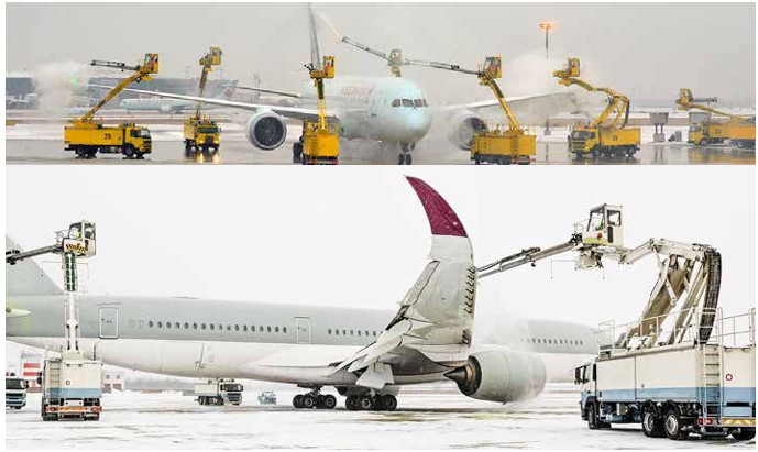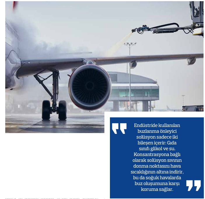 Temel bileşeni propilen glikol olan buzlanmayı önleyici ya da buz çözücü sıvılar, soğuk alandan sıcak alana doğru alçalış yapan uçakların active frost yani yüzeylerinde buz ve don oluşabilecek sıcaklıklarda (sıfır dereceye yaklaşırken) önlem olması için (anti icing), ya da buzlanma görülen yüzeyleri temizlemek için (de icing) uygulanır. Uçağın, de-icing alıp almayacağına belirlenmiş kurallar ve şartlara göre sorumlu kaptan pilot karar verir. Yolcuların işlemin yapılacağına dair bilgilendirilmeleri sağlanır. De-icing/Anti-icing işlemi 10 ile 20 dakika süren bir işlemdir. Eğer incelemeleri sonucunda gerekli görmezse kaptan pilotunuz kar yağan soğuk bir gün de olsa bu işlemi talep etmeyebilir. Akışkanlığı de-icing e göre daha yüksek olan anti-icing sıvısı uygulandığı yüzeylere tutunarak kalkış öncesi uçağın taksi yaptığı süre boyunca üzerinde herhangi bir buzlanma olmasını ya da kar birikintisi oluşmasını engellediği için, bu işlemlerin yapılmasından sonra uçağın kalkış için fazla bekletilmemesi gerekmektedir.